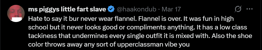 真的,别再穿法兰绒了。它早就过时了,高中穿穿还行,但它既不显好看,也不加分。只会显得土气,把整套搭配都毁了。”
