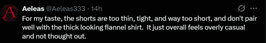 就我的品味而言,短裤太薄、太紧、太短,与看起来很厚的法兰绒衬衫搭配得也不好。整体感觉过于随意,没有经过深思熟虑。