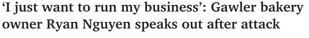原文:https://www.adelaidenow.com.au/news/south-australia/i-just-want-to-run-my-business-gawler-bakery-owner-ryan-nguyen-speaks-out-after-attack/news-story/c684aaf015abdba20cf6dd2b41fd3c60