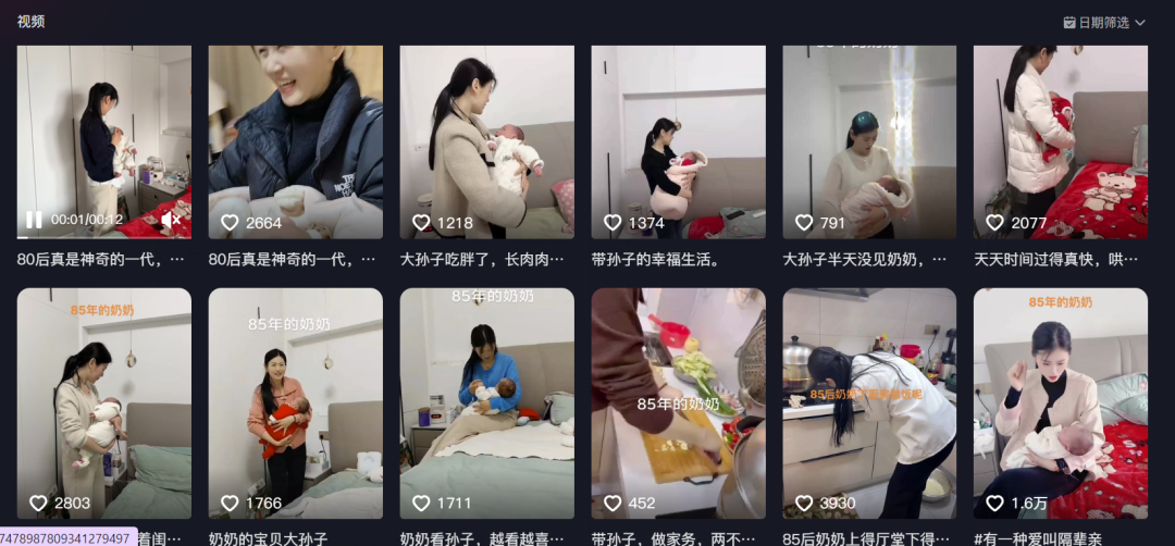 她平时发布的视频内容主要是日常生活,比如给孙子喂奶、换尿布,或者为家人做饭。
