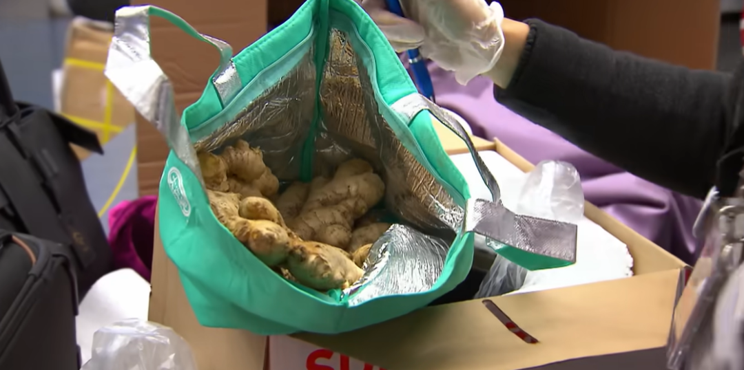 海关人员从里面翻出一大袋沾满泥土的新鲜生姜...