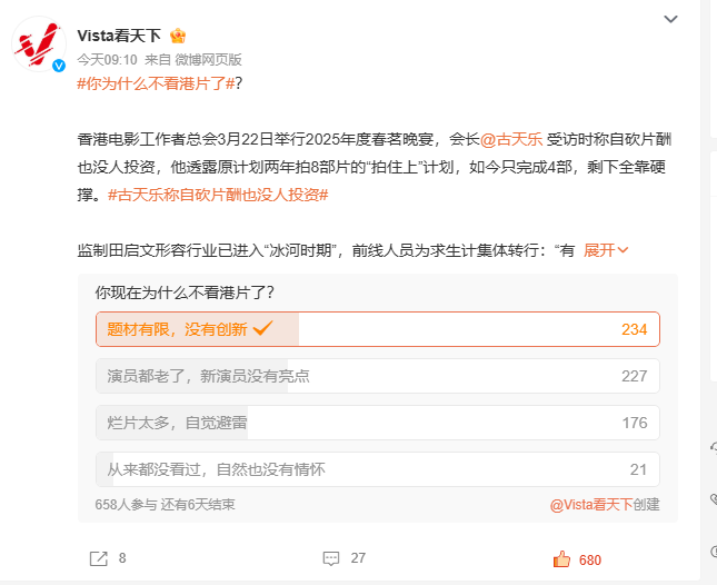 在一份微博的“你为什么不看港片了”的投票中,大量网友选择了“题材有限,没有创新”“演员都老了,新演员没有亮点”和“烂片太多”。