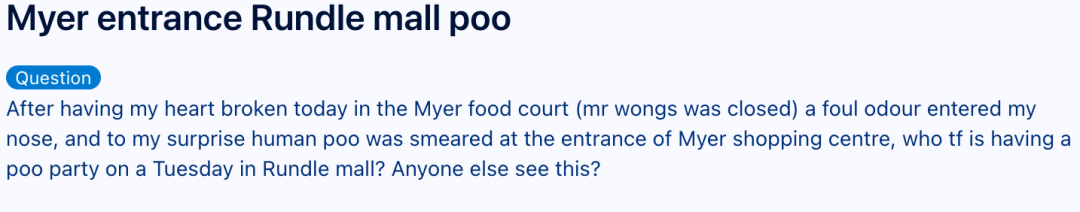 震惊之余,该网友不禁在帖子中质疑:“谁会在周二的Rundle Mall搞一场‘粪便派对’?”
