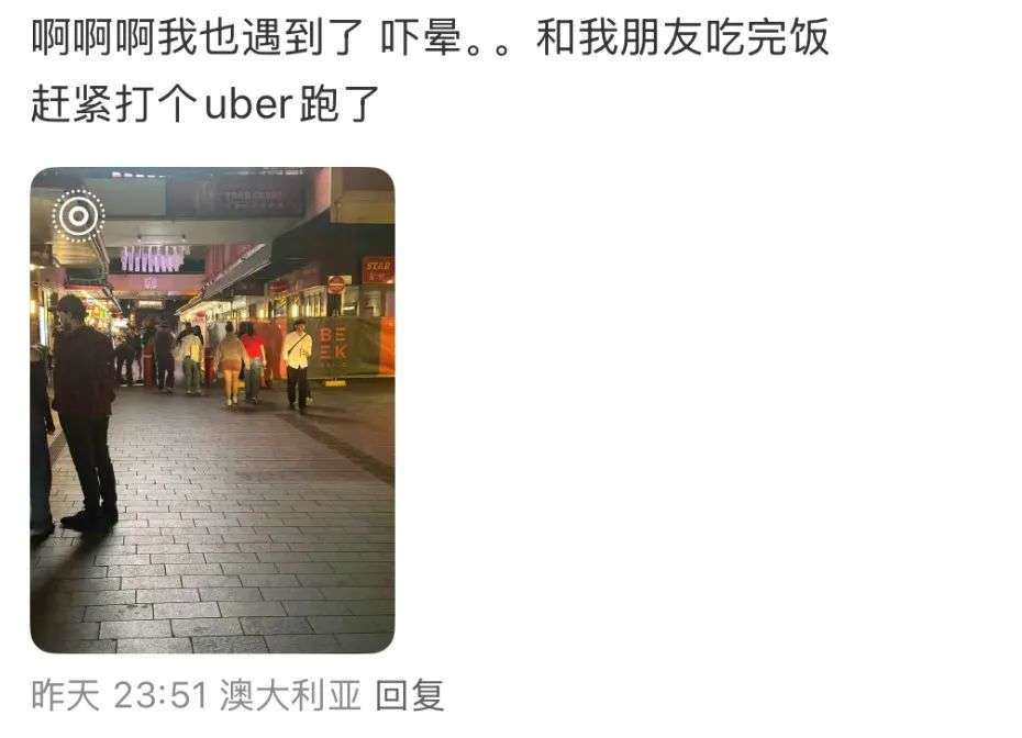 在场的华人网友留言表示:“啊啊啊啊我也遇到了,吓晕…和我朋友吃完饭赶紧打个uber跑了。”