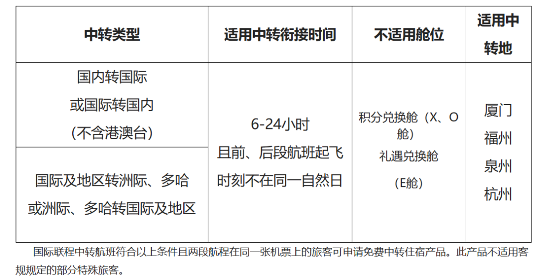 任一渠道购买厦航出入境联程中转航班,符合条件就可在厦门、福州、泉州和杭州4地的中转酒店享免费住宿;或在厦门、福州2地的中转休息室尽情休整,让您舒适轻松,整装“再”出发!