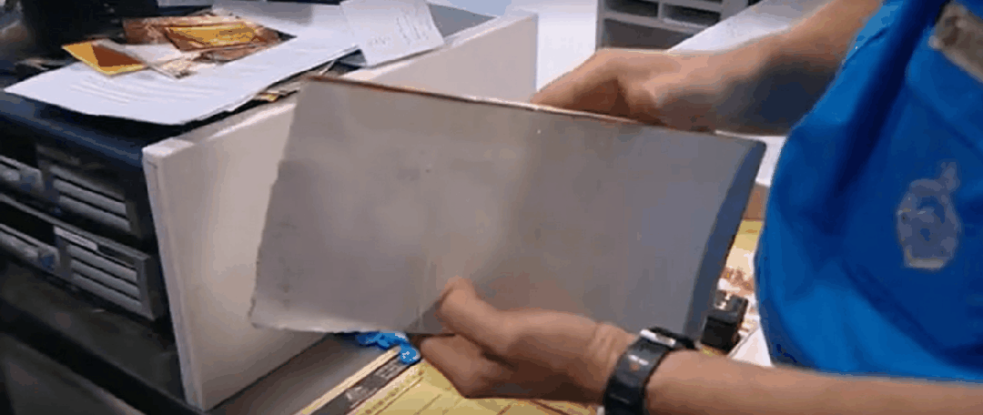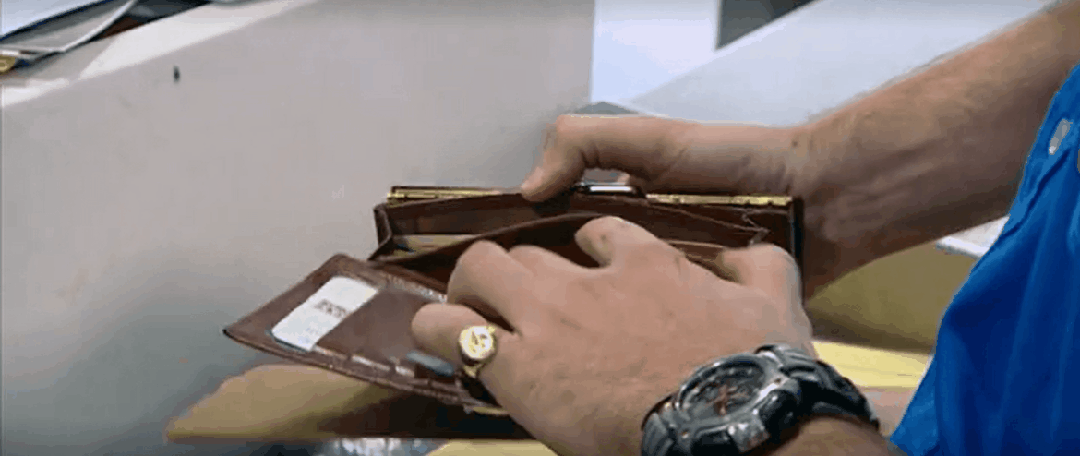 随后工作人员就例行打开了他的背包,在翻出一大堆的杂物后,发现了一个木板,翻转过来是个旧旧的钱包。