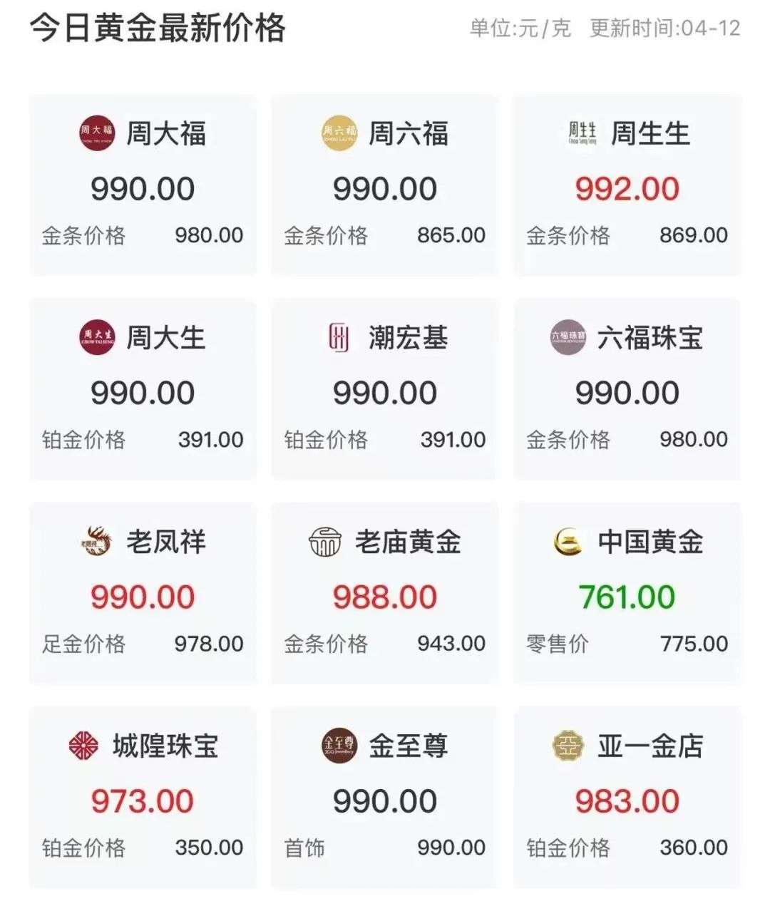 国内金饰价格也随之升至历史高位。截至4月12日,周生生足金饰品标价已达992元/克,周大福足金、周六福足金999的饰品价格均为990元/克,老庙黄金足金饰品价格988元/克。