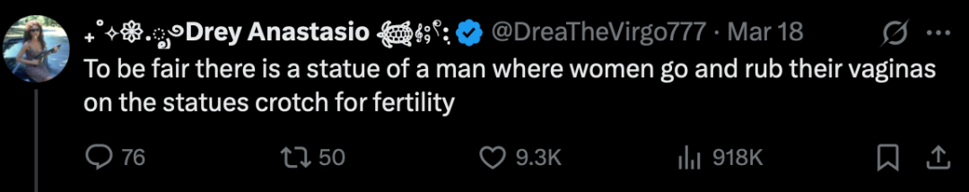 ”公平地说,我知道有一尊男性雕像,女性会用阴道摩擦雕像的裆部,以求生育。”