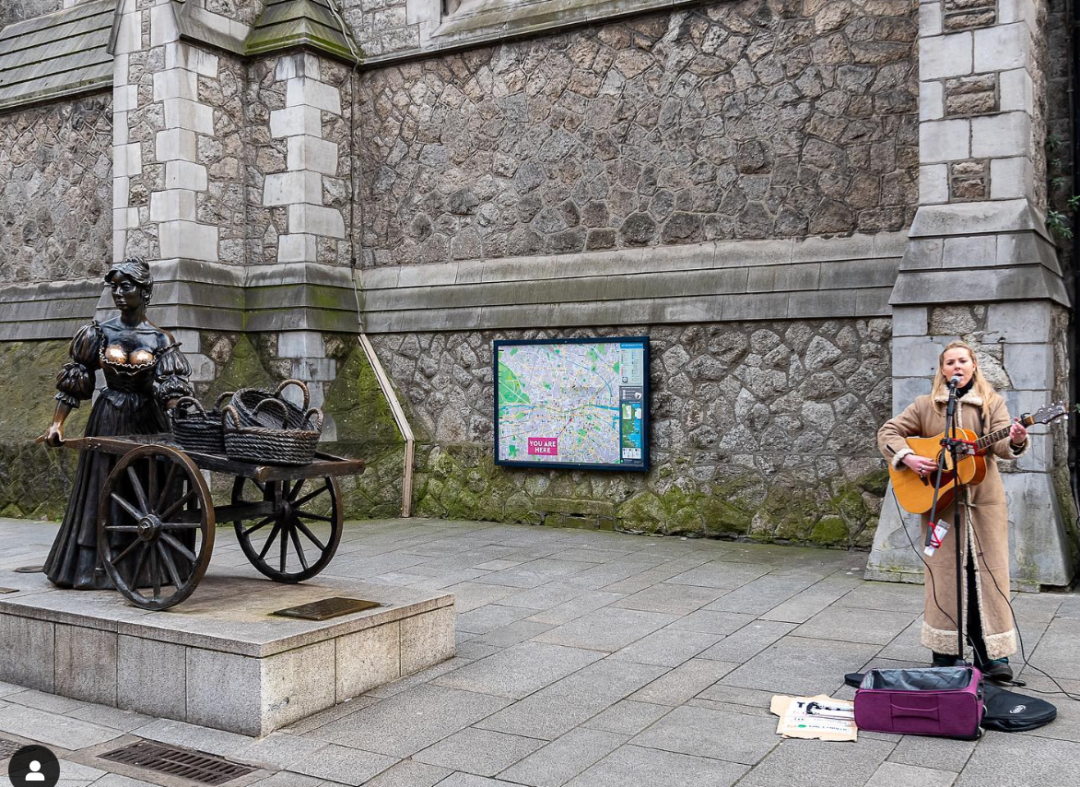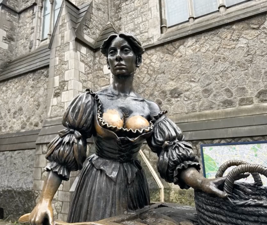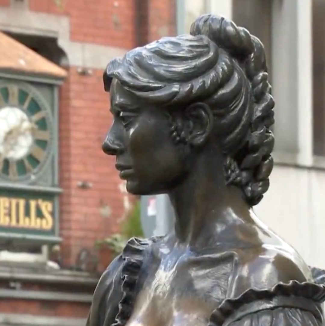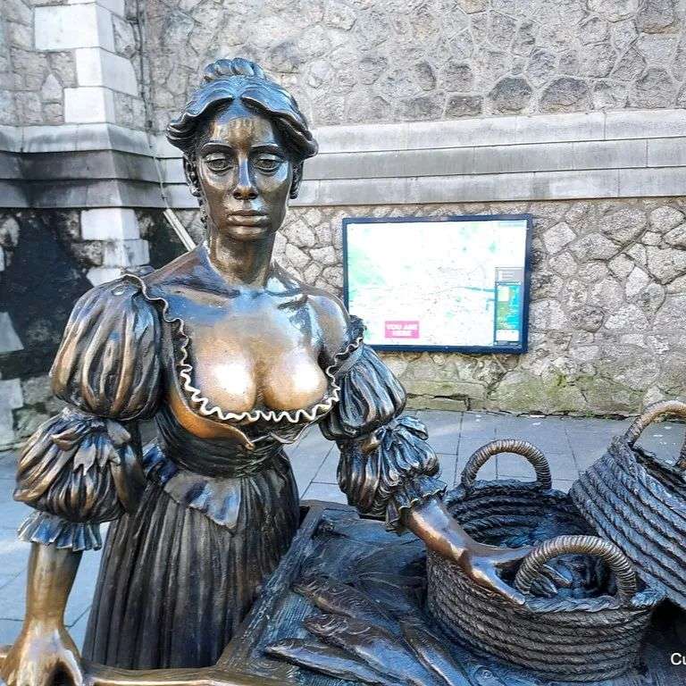 2012年,都柏林的一位本地导游带来了一群外国观光游客,游客们在这个市中心文化景点稍作停留,观瞻一下这位从都柏林英雄悲剧赞美诗《蛤蜊和贻贝》诞生的女主人公,莫莉·马龙 (Molly Malone)。
