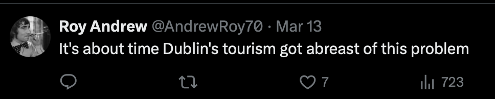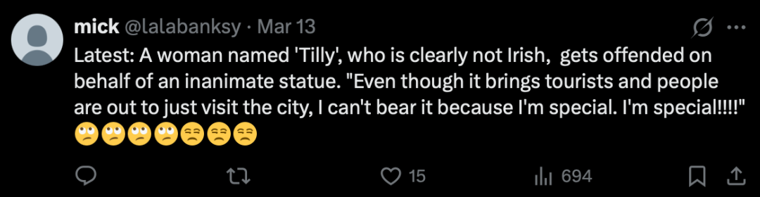 “最新消息:一位名叫Tilly的女子,显然不是爱尔兰人,因为一座无生命的雕像而感到被冒犯。即使它吸引了游客,人们出来只是为了参观这座城市,‘我也无法忍受,因为我很特别。我很特别!!!!’”