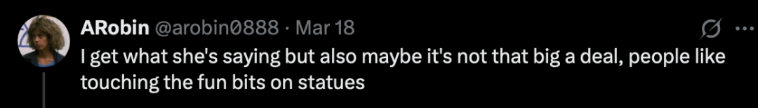 “我明白她的意思,但或许这没什么大不了的,人们喜欢摸雕像上那些有趣的地方。”
