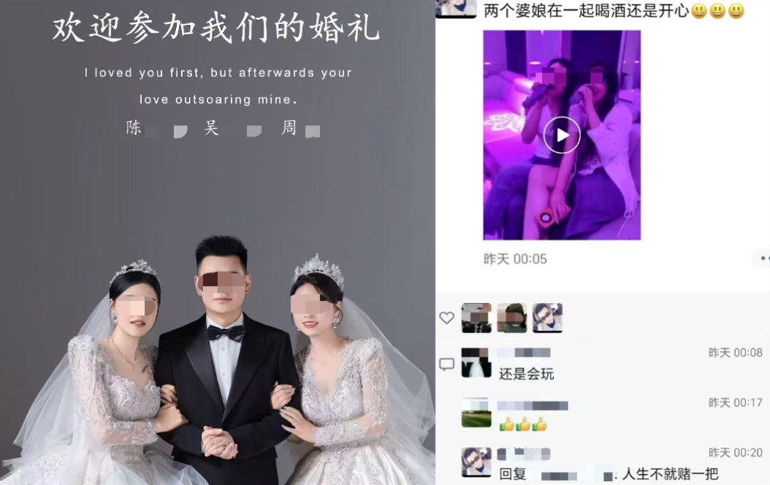 网上不仅有三人拍结婚照的亲昵花絮,男方朋友圈里还发了两位女主KTV同台飙歌的小视频,一时间被捧成“人生赢家”。