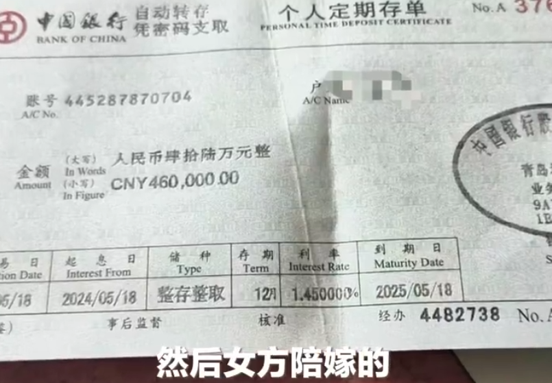 小申父母留了个心眼,说先给150000万的存款单。