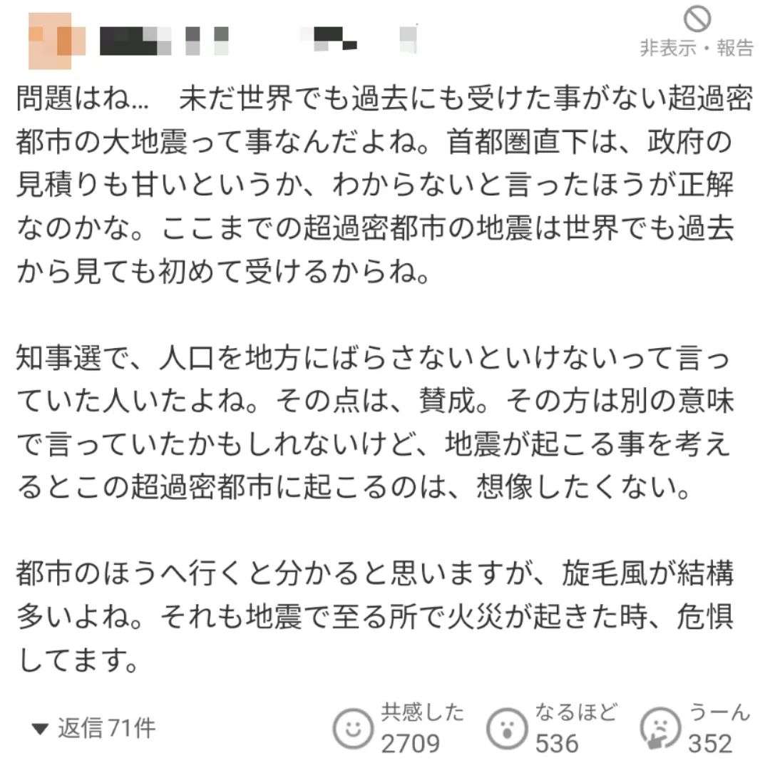 问题是…在世界上和过去都没有经历过的超过密城市的大地震。在首都圈正下方,政府的预估也太天真了,还是说不知道才是正确的。到现在为止的超密集城市的地震无论从世界还是从过去来看都是第一次。在知事选举中,有人说过要把人口分散到地方去。这一点我赞成。那个人可能是从别的意义上说的,但是一想到发生地震,就不想想象在这个超过密的城市发生。如果在城市的话会发现小型龙卷风挺多的,在地震中到处都发生了火灾时,我也很担心。
