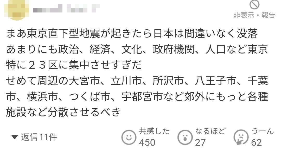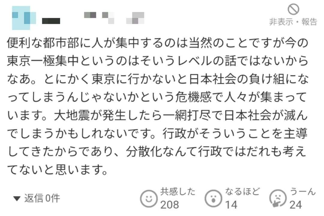人们集中于便利的城市地区是理所当然的,但现在的东京的极度集中并不是那种水平。无论如何,人们都带着一种危机感,认为如果不去东京,会不会成为日本社会的输家。如果发生大地震,整个日本社会可能会毁于一旦。因为行政主导了这种事情,分散化之类的行政谁都没有考虑。
