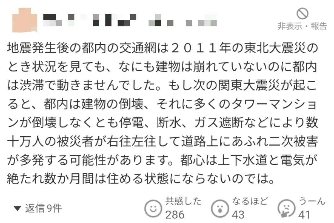 看了一下2011年东北大地震的地震发生后的交通网,虽然建筑物没有倒塌,但东京都内却因交通堵塞而无法移动。如果下一次关东大地震发生的话,东京都内建筑物发生倒塌,即使很多坚固的公寓没有倒塌,由于停电、停水、煤气切断等原因,数十万受灾者东奔西走,道路上也有可能发生二次灾害。市中心上下水道和电被切断,几个月不能成为可以居住的状态。