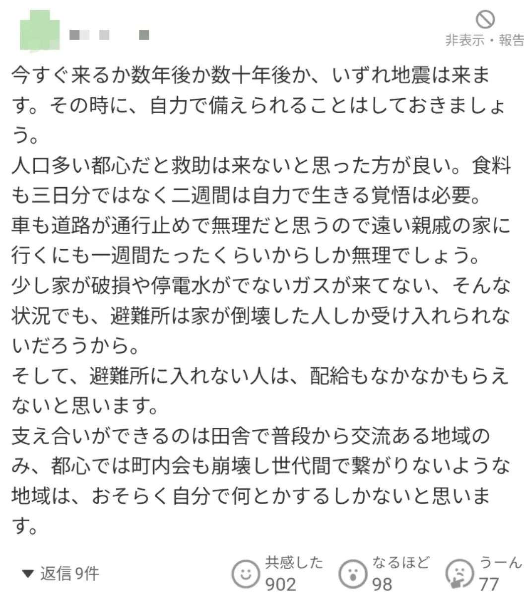是现在来,还是几年后,还是几十年后,地震总会来的,尽量自己准备吧。在人口众多的市中心,最好是做好不被救援的准备,食物也不能只储备三天的量,需要准备两周靠自己的力量生存下去的觉悟。那时,由于道路堵塞,所以去远的亲戚家也只能从一周后才开始。在这种情况下,避难所也只能接受房屋倒塌的人。不能进入避难所的人,也很难拿到物资。能互相支持的只有在乡下平时就有交流的地区,在市中心町内会也崩溃了,世代间不和谐的地区,恐怕只能自己想办法了。
