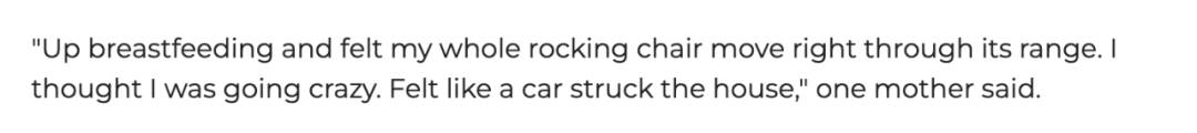 还有一位妈妈表示,"正起来喂奶时,突然发现摇椅整个晃动起来,摆动幅度特别大。那一瞬间我以为自己出现幻觉了,简直像有汽车撞进房子。"