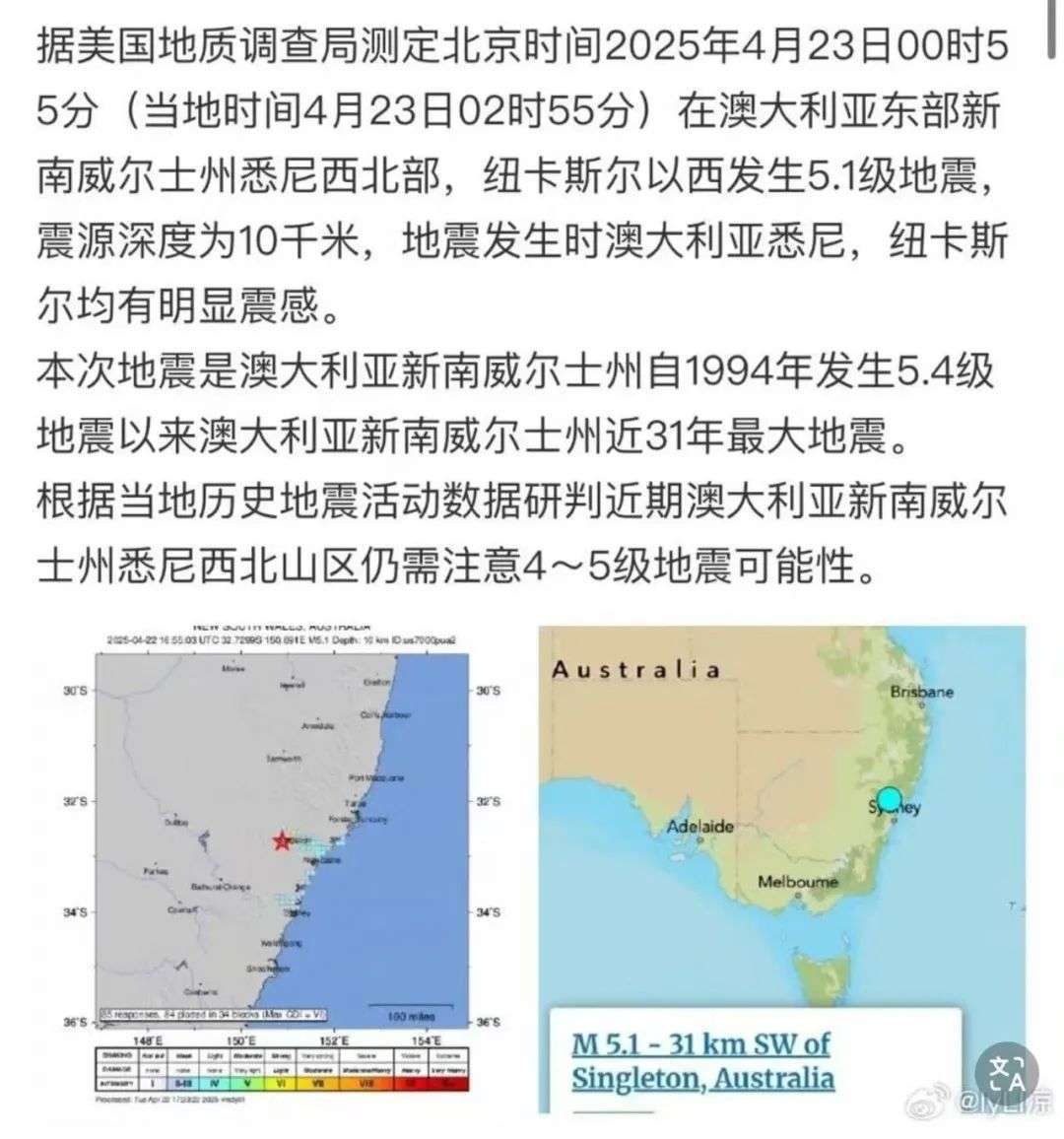 据多家澳媒报道,新州Newcastle周三凌晨3点发生5.1级地震,包括悉尼在内多个地区有明显震感。