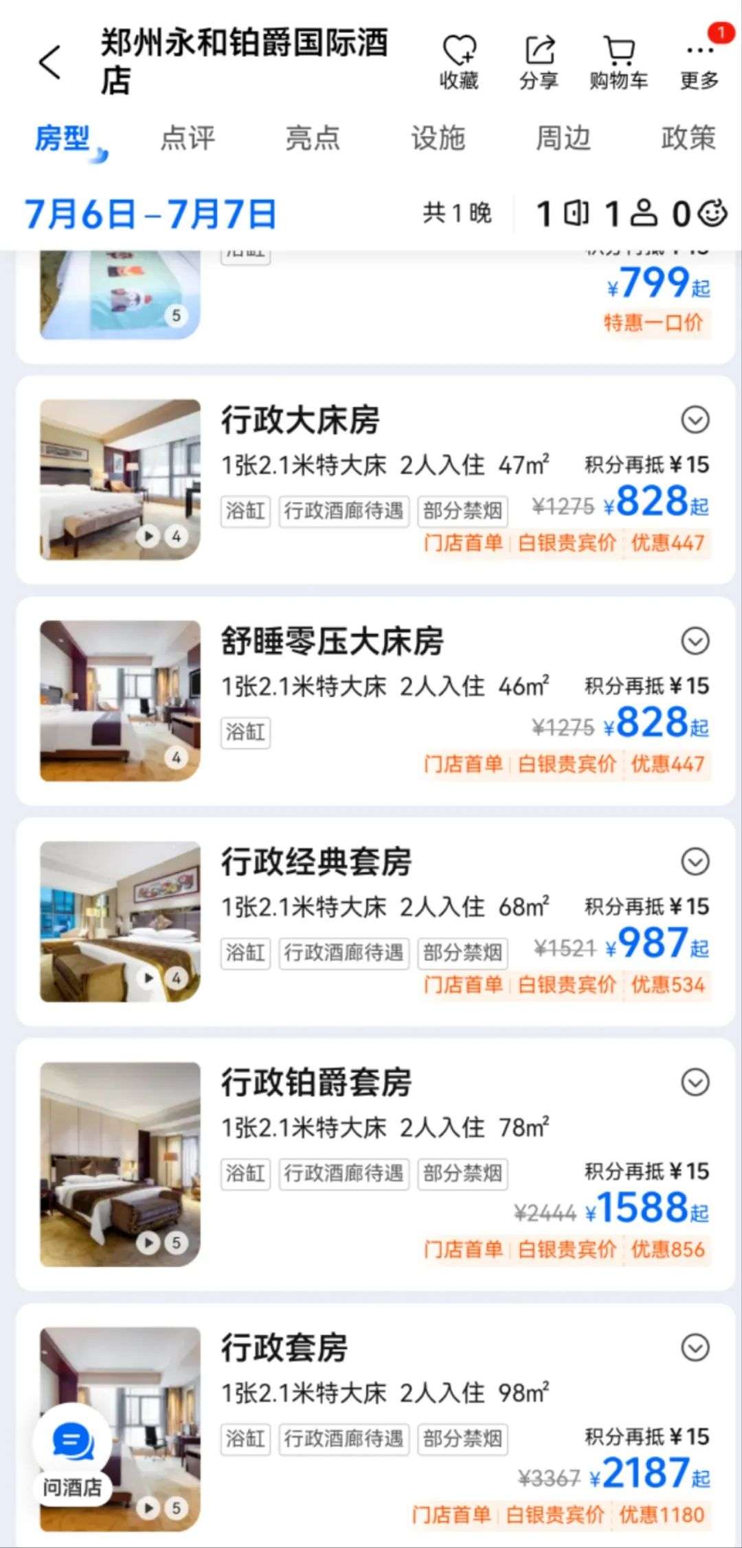 小编在平台上查询了解到,这家五星级酒店最贵的行政套房标价2187元一晚,最便宜的房型578元一晚,酒店的轩粤中餐厅人均253元。