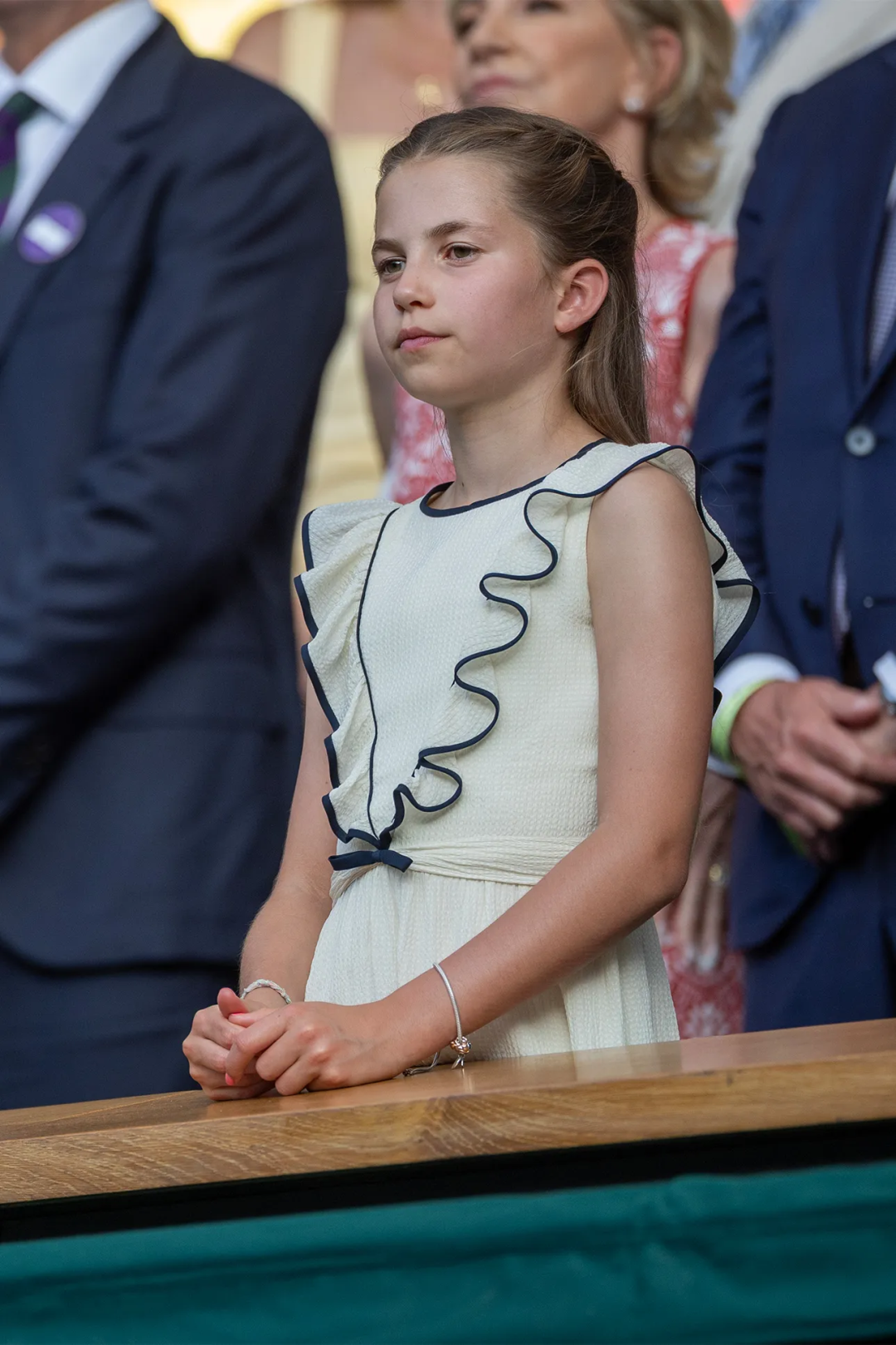 温布顿男子单打决赛当日,夏洛特公主首度以一只 Pandora 蛇链手镯惊艳亮相,和家人坐在皇家包厢中,神情专注!