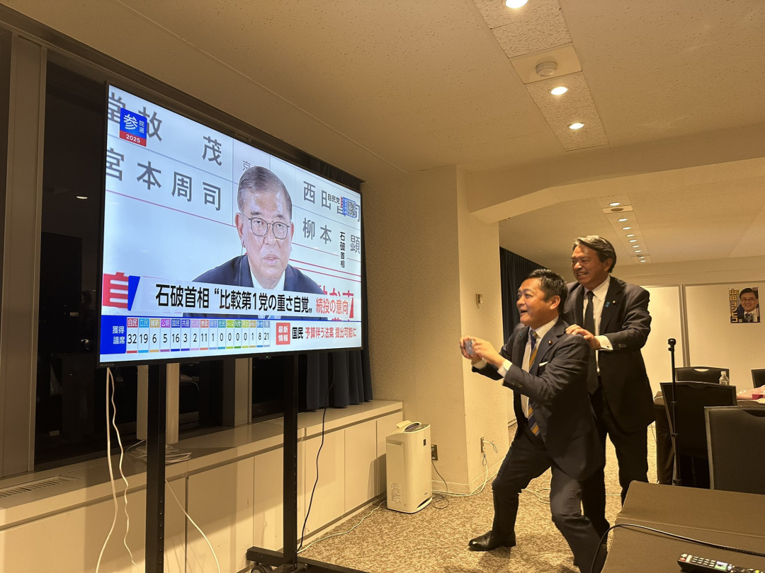 ·日本参议院投票结果出来后,日本国民民主党成员在庆祝。