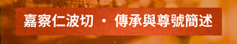 「國師」的稱號則來自明朝皇帝的冊封。第一世嘉察仁波切帕久敦珠被明英宗封為「灌頂大國師」,後又被授予「國公」頭銜。明景泰帝進一步禦賜「國師」尊銜與金印,以彰顯其慈悲與甚深廣大的智慧,象徵仁波切在漢藏佛法交流中的殊勝功德。自此之後,「嘉察仁波切」與「國師」並稱,流傳至今,成為尊崇而莊嚴的尊號。
