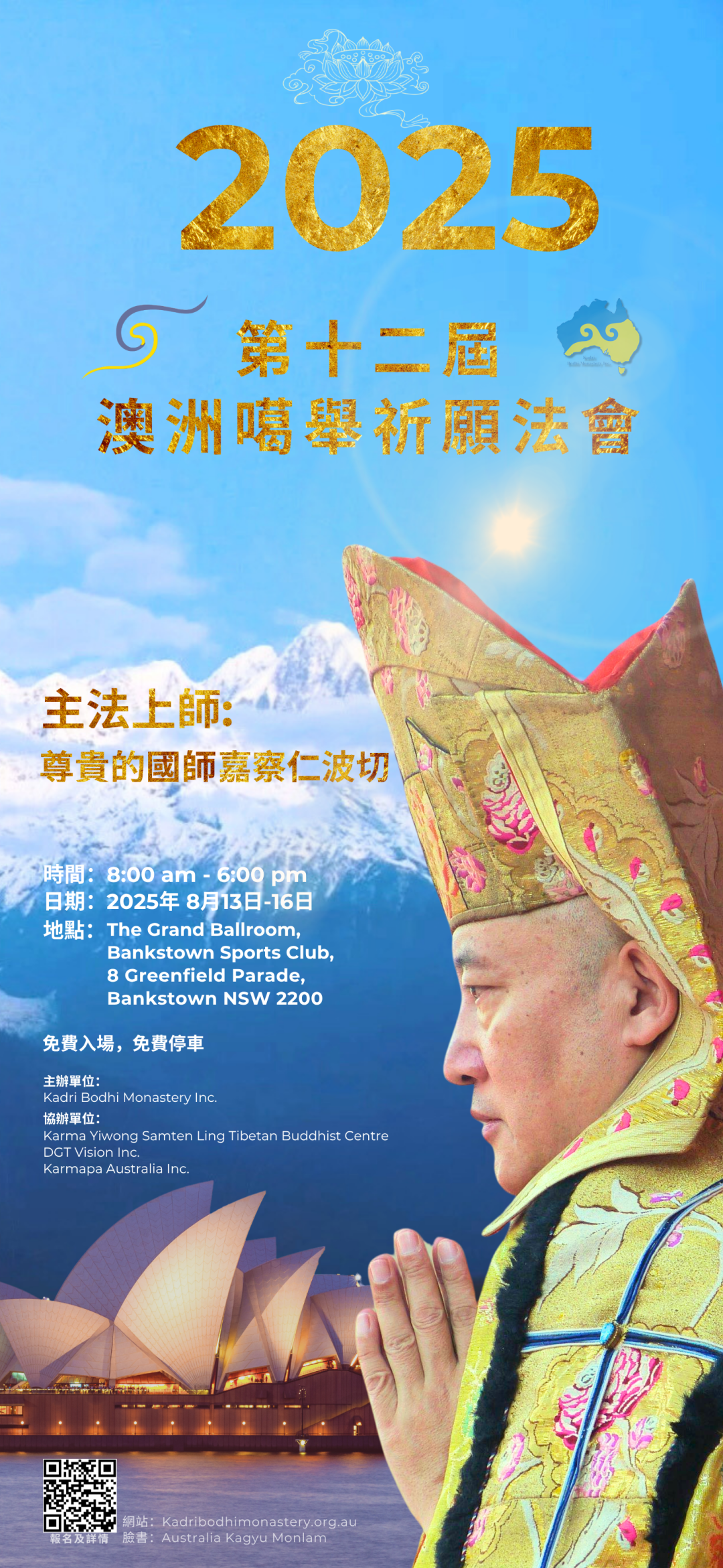 2025年第十二屆澳洲噶舉祈願法會將於8月13日至16日,在悉尼 Bankstown (The Grand Ballroom, Bankstown Sports Club, 8 Greenfield Parade, Bankstown NSW 2200) 隆重舉行,由尊貴的嘉察仁波切親臨主法(法會具體內容請點擊鏈接:https://www.auyx.com//Web/News/share/id/318946.html)。