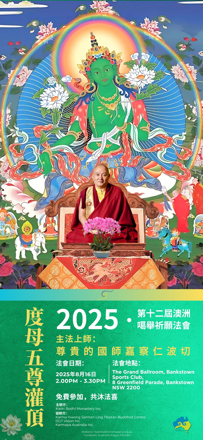 在澳大利亞噶举寺庙Kadri Bodhi Monastery Inc. 多年來的殷切期盼與誠摯邀請下,尊貴的噶舉國師第十二世嘉察仁波切,即將於下月初首次蒞臨南半球澳大利亚悉尼,展開弘法行程,親臨主法第十二屆澳洲噶舉祈願法會,並分别在Bankstown Sports Club與悉尼市政廳Sydney Town Hall親授兩場殊勝灌頂,為澳洲信眾帶來法雨甘露與無上加持。
