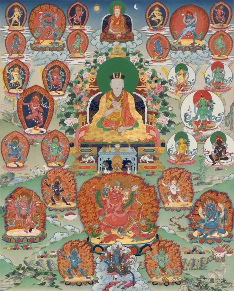 壇城中央主尊為綠度母,四周環繞其餘四位女性本尊,皆為金剛乘佛教中地位崇高的重要本尊。壇城正前方為摩利支天(Marici),亦稱奧瑟千瑪(光明母 Oser Chenma),其修持可協助行者消除來自敵人、盜賊或搶劫所引發的障礙。