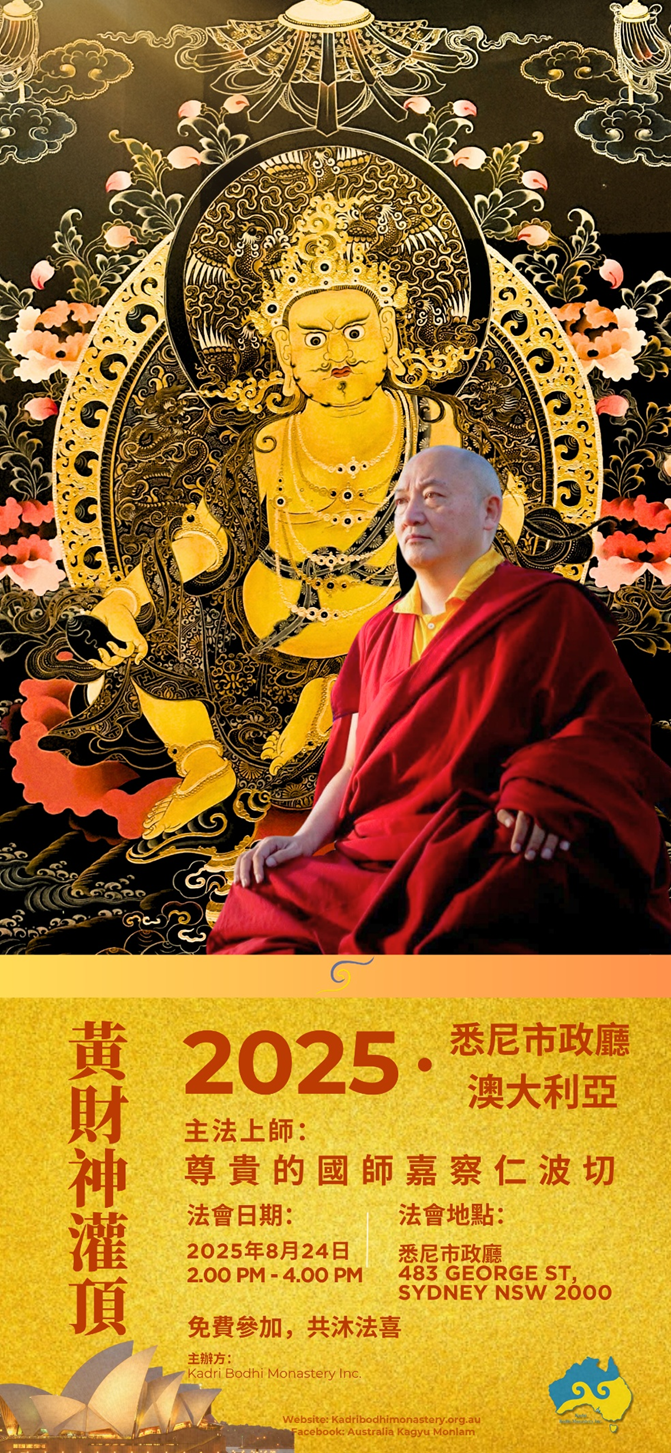 此外,8月24日(星期日)下午二時至四時,嘉察仁波切將於悉尼市政廳舉辦第二場殊勝灌頂——黃財神灌頂法會。