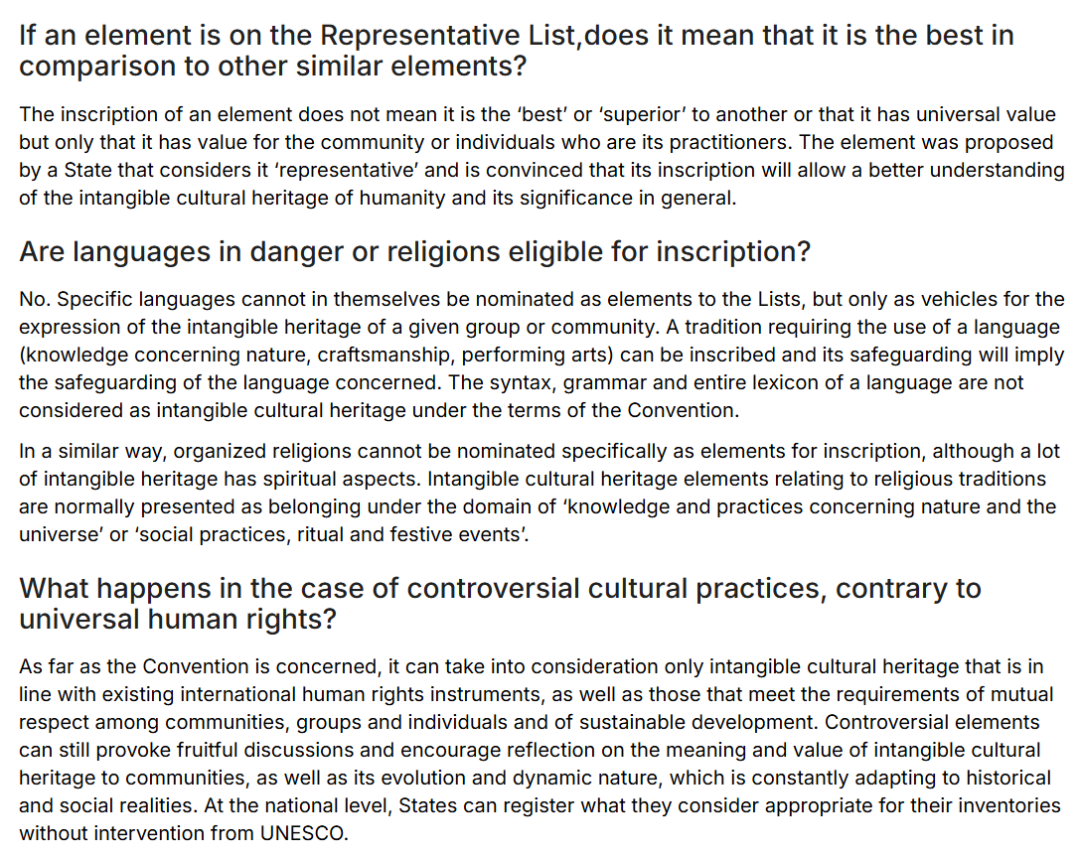 联合国教科文组织在有关《公约》的常见问题中明确,一项遗产的列入并不意味着它相较其他遗产是“最好的”或“更优越的”,也不意味着它具有普遍价值,而仅仅意味着它对实践该遗产的社区或个人具有价值。遗产是由一个国家提出的,只要该国认为它具有“代表性”,并坚信其列入将有助于人们更好地理解人类非物质文化遗产及其普遍意义。