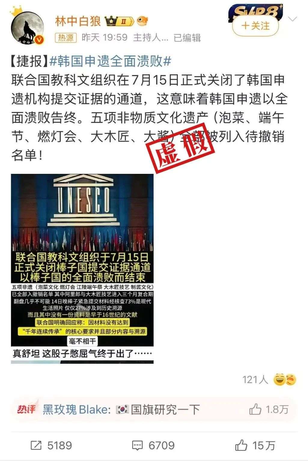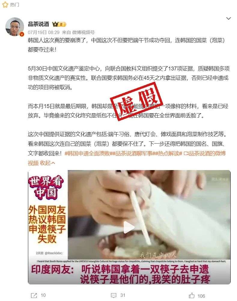 近日,社交平台广泛流传说法称,“联合国教科文组织在7月15日正式关闭了韩国申遗机构提交证据的通道,意味着韩国申遗以全面溃败告终。五项非物质文化遗产(泡菜、端午节、燃灯会、大木匠、大酱)全部被列入待撤销名单。”