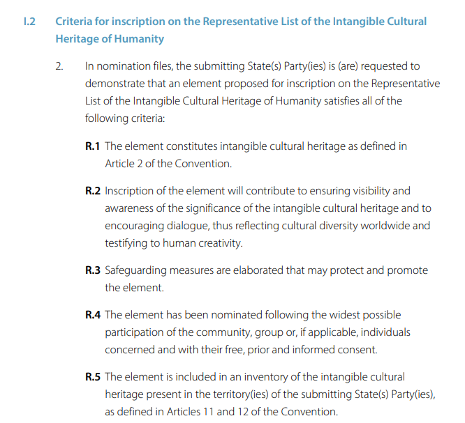 ●历史上,联合国教科文组织极少做出将已列入《人类非物质文化遗产代表作名录》的遗产移除该名单的决定。被列入《人类非物质文化遗产代表作名录》需要符合一定标准,但相关标准未涉及文化溯源或传播路径方面的讨论。