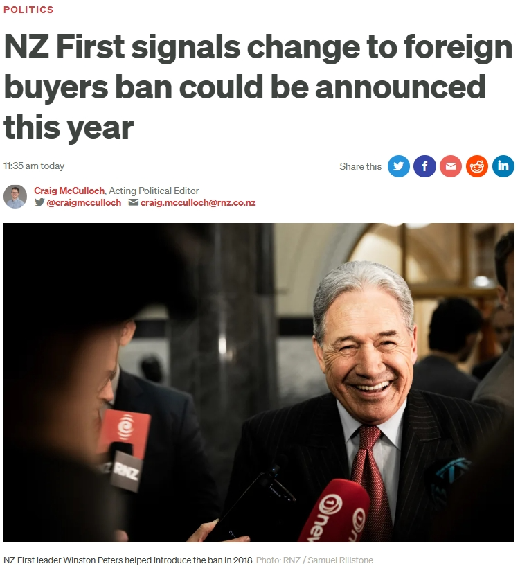 据称,优先党领导人Winston Peters已经表示这项“变动”预期会在今年内公布,但他否认优先党对于“海外买家”的立场变软。