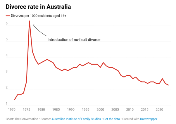 据澳大利亚统计局数据,离婚率已降至自1976年无过错离婚法实施以来的历史低点。