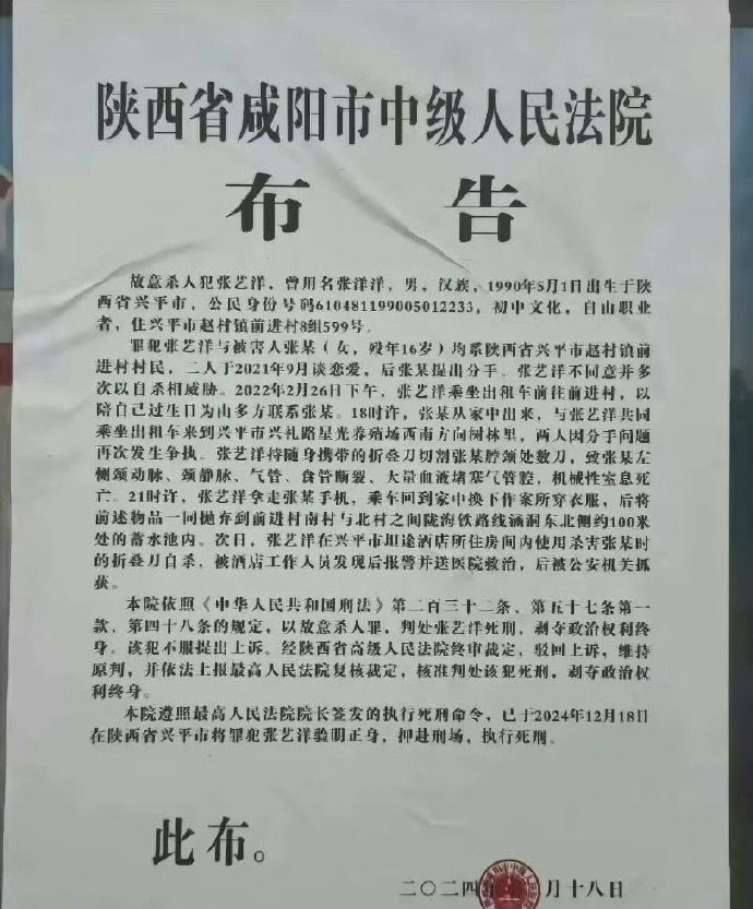 2024年12月18日,陕西省咸阳市中级人民法院遵照最高人民法院院长签发的执行死刑命令,将罪犯张艺洋验明正身,押赴刑场,执行死刑。