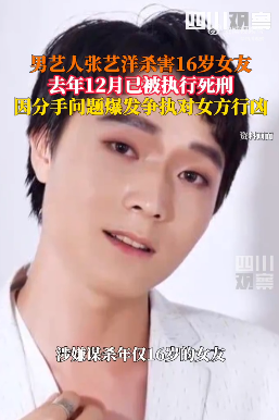 男艺人张艺洋杀害16岁女友,于去年年底被执行枪决,成为中国首位被依法枪决的艺人。