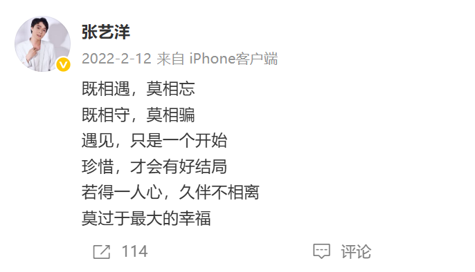 最后一条微博发布于2022年2月12日,内容为:“既相遇,莫相忘;既相守,莫相骗;遇见,只是一个开始,珍惜,才会有好结局,若得一人心,久伴不相离,莫过于最大的幸福。”