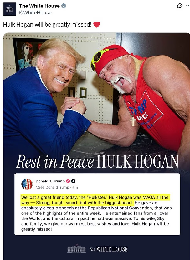 特朗普在社交平台写道:“我们今天失去了一位伟大的朋友,‘Hulkster’。......强大、坚韧、聪明,还拥有最大的心。”