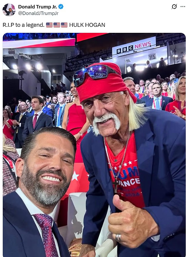 小唐纳德·特朗普(Donald Trump Jr.)也晒出自己与霍根在2024年大会上的合照,表达敬意。