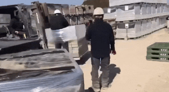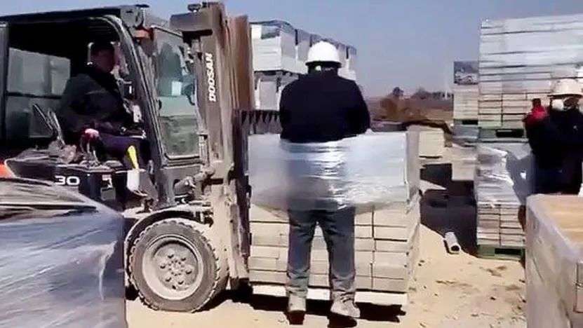 视频中,A某被同事们用透明胶布绑在运砖块的叉车上,叉车“端着”他在砖厂转悠,他跑也跑不了,只能任凭他人欺负。