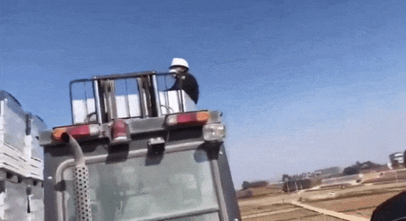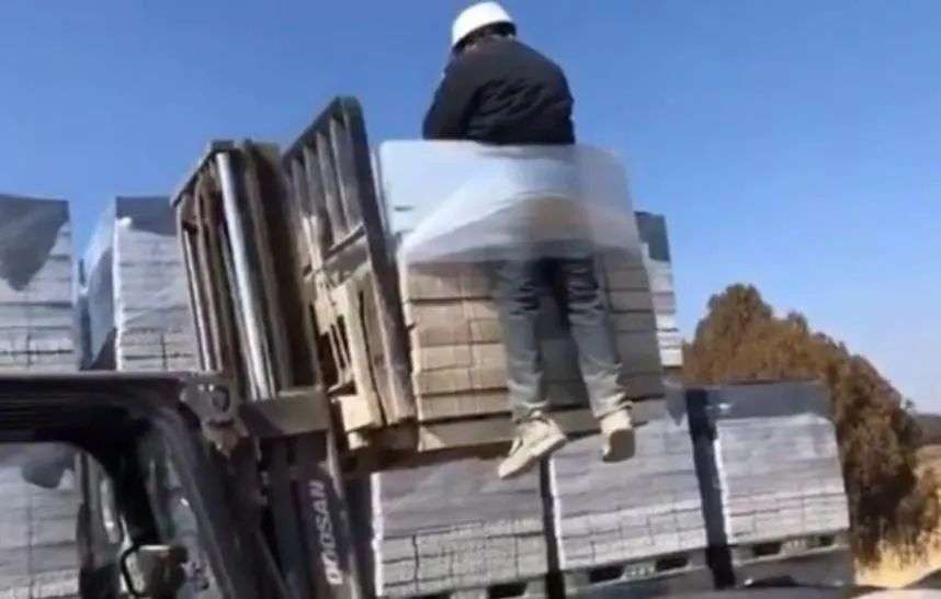 而且,画面中还有一个同事,举着手机,追着叉车录下A某的窘态。