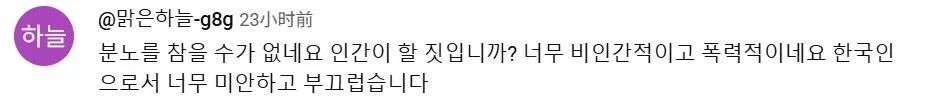 “我实在忍不住要生气。这是人干的事吗?太不人道了,太暴力了。作为一名韩国人,我觉得非常抱歉和羞愧。”