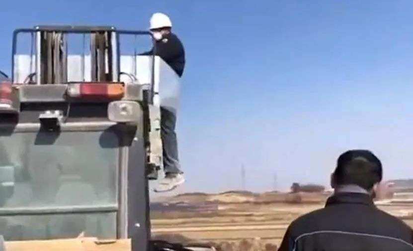 另一段视频中,叉车把A某举起来,让他无措地悬在半空中,周围同样有同事在饶有兴致地围观。