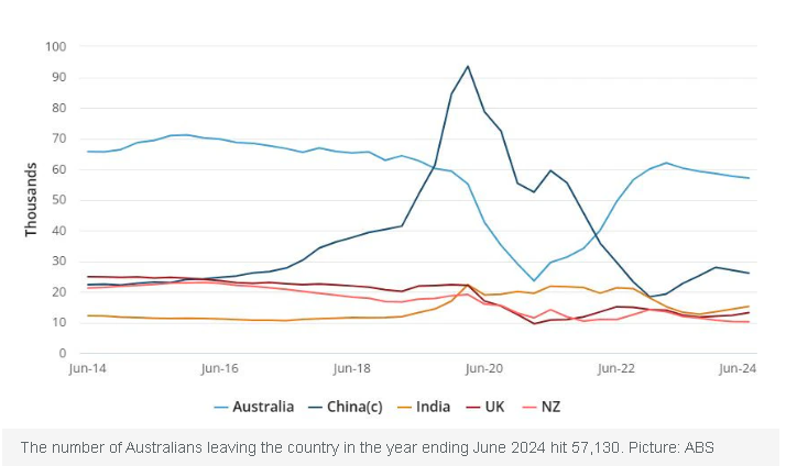 数据显示,2023-2024年间,22.1万澳洲人永久搬离本国,比前一年增长了8%。