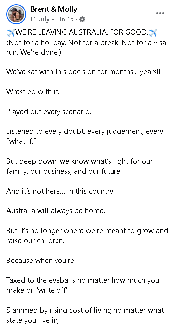 最近,来自昆州的一对社交媒体夫妻 Brent 和 Molly Orwell 在脸书上发文,宣布他们一家四口将“永久离开澳洲”,不为度假、不为签证,而是直接走人,不回头的那种。