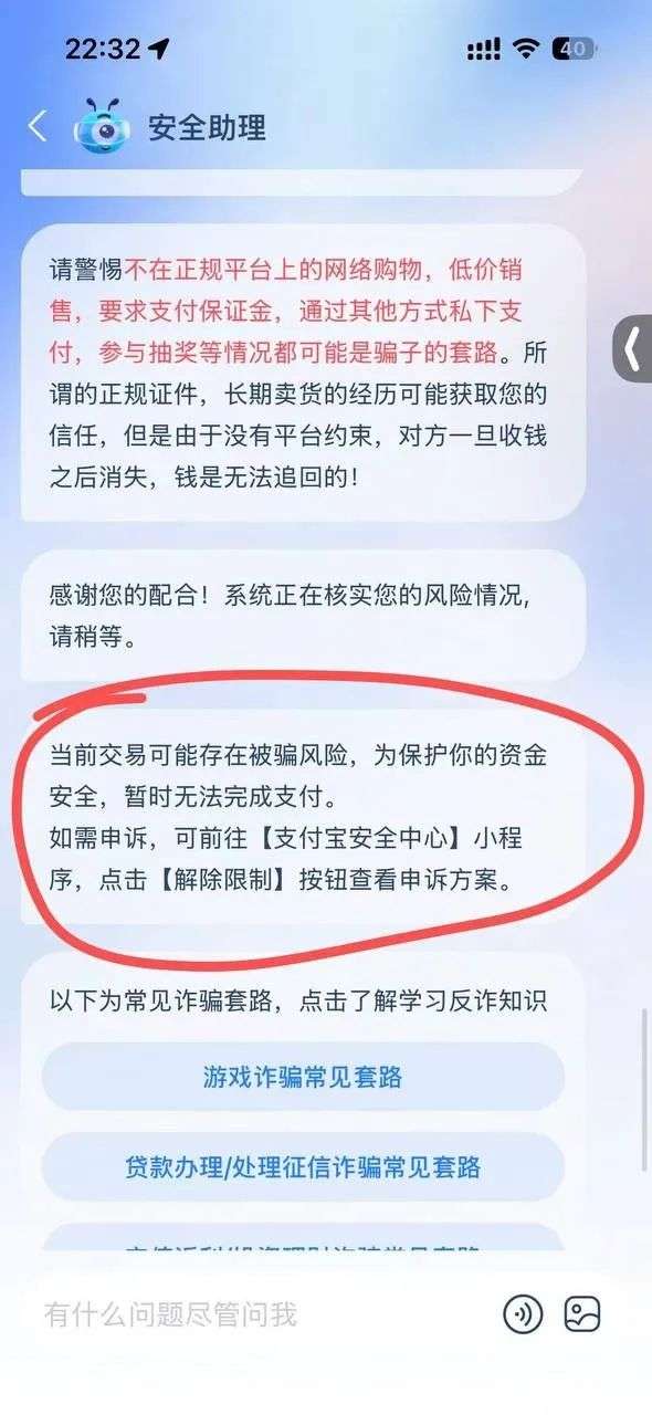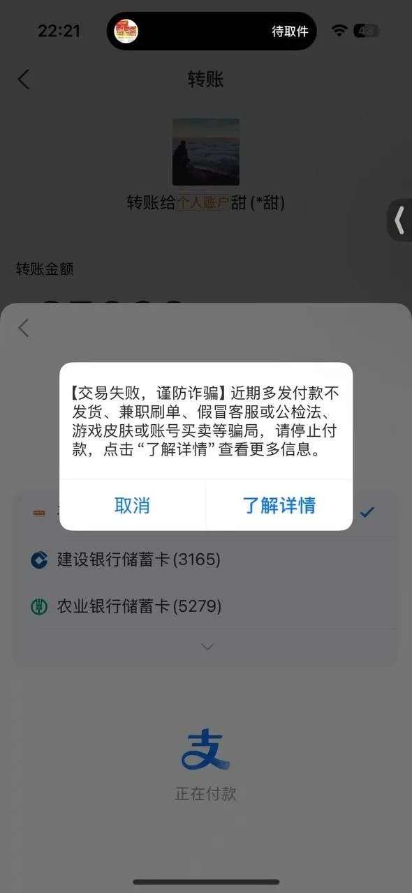 其中第一笔支付了2.5万元,在支付第二笔的时候,提示对方账户有风险,接连换了几个支付宝账户都无法支付,并且导致Susan的支付宝账户也被封了。
