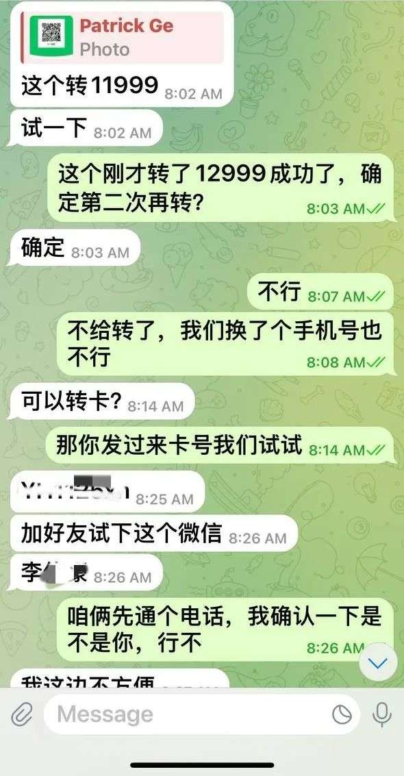 后来改为微信账号支付,同样是对方发了几个微信二维码,都显示对方账户有风险,终于有一个能够支付成功,Susan又支付了12999元人民币,还需要再转11999元的时候。Susan终于醒悟过来,要求先见面再支付最后一笔。