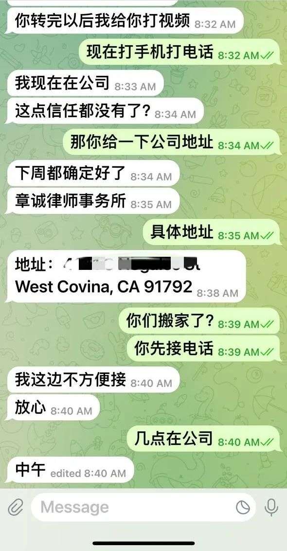 7月25日,Susan匆匆忙忙来到章诚律师事务所,见到Patrick Ge的时候,才发现这一切都是骗局,之前几天和她聊天的根本不是Patrick Ge本人,然而找出对方的“纸飞机”社交媒体账户查看,发现几乎和Patrick Ge的一模一样。